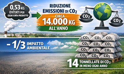 Considerando che ogni kwh prodotto dal nuovo Impianto fotovoltaico evita l’emissione di 0,53 Kili di Anidride carbonica, tale progetto con produzione prevista di 27.000 kwh annui, comporterà una riduzione di emissioni di anidride carbonica pari a circa 14.000 Kili all’anno.